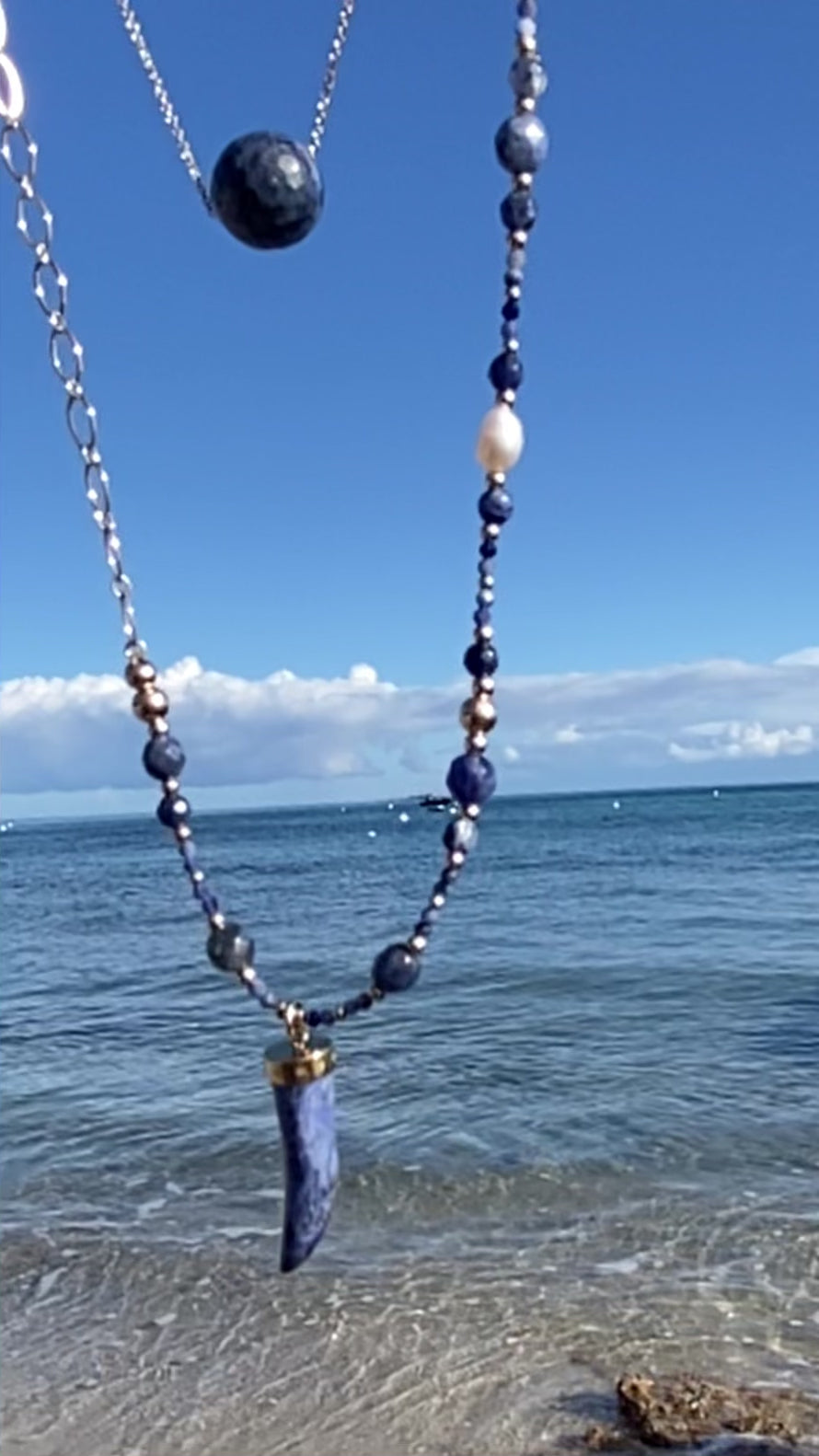 Le collier DIFESA double rang Bleu est un sautoir avec deux pendentifs en sodalite, montés sur fil câblé et deux chaînes en or laminé et assortis avec des perles en or laminé 14 carats, de perles d'eau douce et de sodalite.
